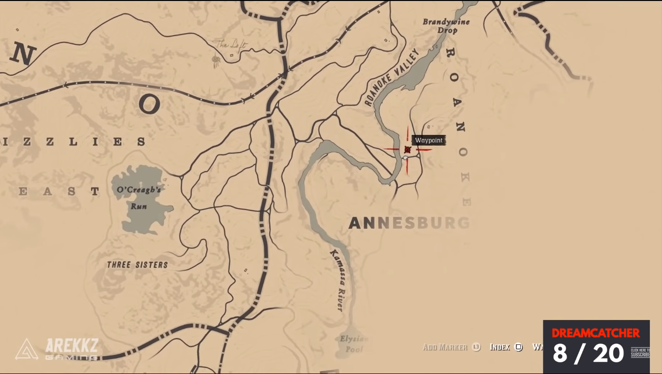- This time, set a waypoint on the just above the road between Annesburg and Roanoke Valley. Again, head into the trees to spot this fairly obvious Dreamcatcher.